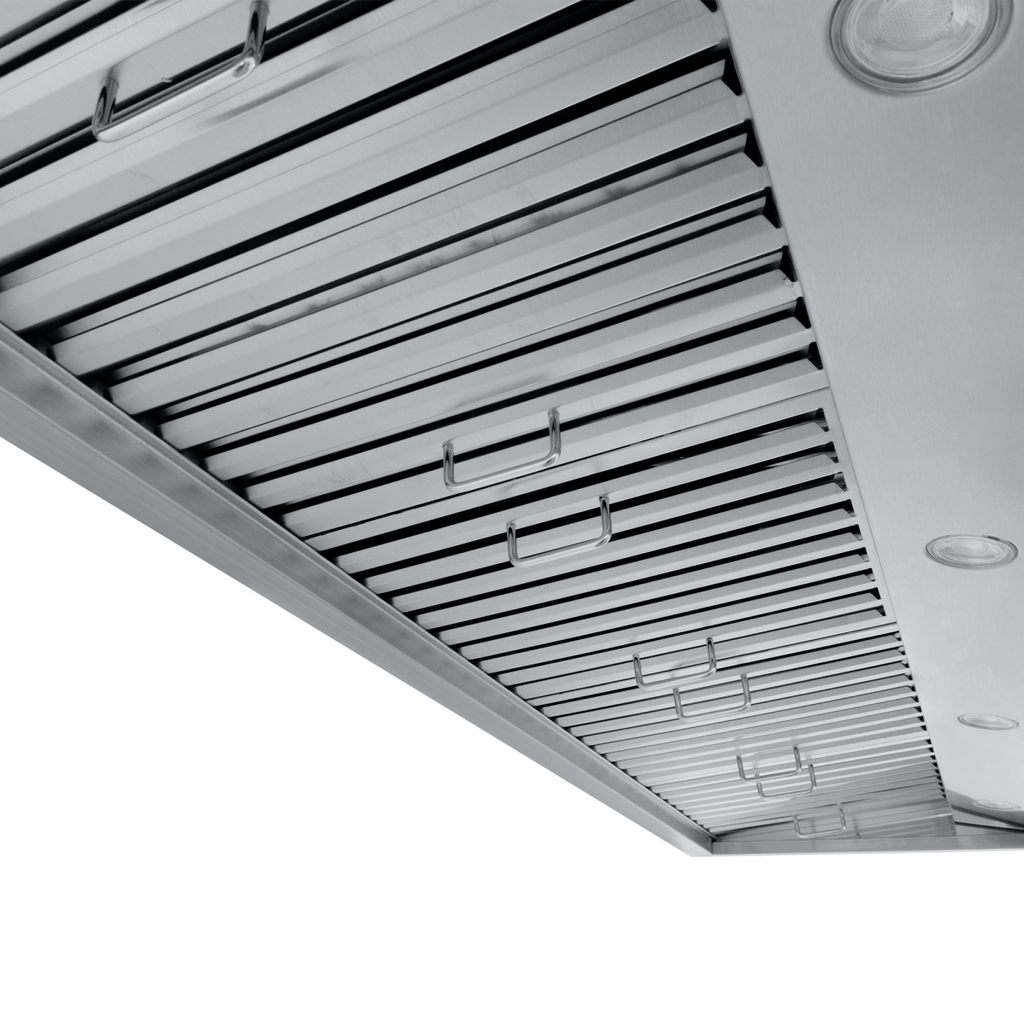 This wall mount range hood comes with long-lasting LED lights to improve your experience in the kitchen. The stainless steel baffle filters are dishwasher-safe, so you’ll spend less time cleaning and more time preparing a delicious meal.