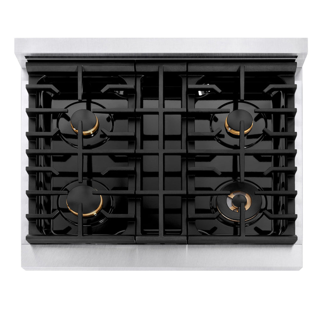 The ZLINE 30 in. 4.2 cu. ft. Paramount Gas Range with 4 Burner Cooktop and Convection Gas Oven in Stainless Steel (SGR30) features a versatile gas cooktop with 4 Italian-made auto-reignition burners, a high-performing gas convection oven, enhanced cast iron grates, and a Horizon oven door window design allowing you to master every meal. With a modern, timeless style and refined functionality, ZLINE Paramount Gas Ranges are masterfully crafted to deliver an elevated culinary experience.