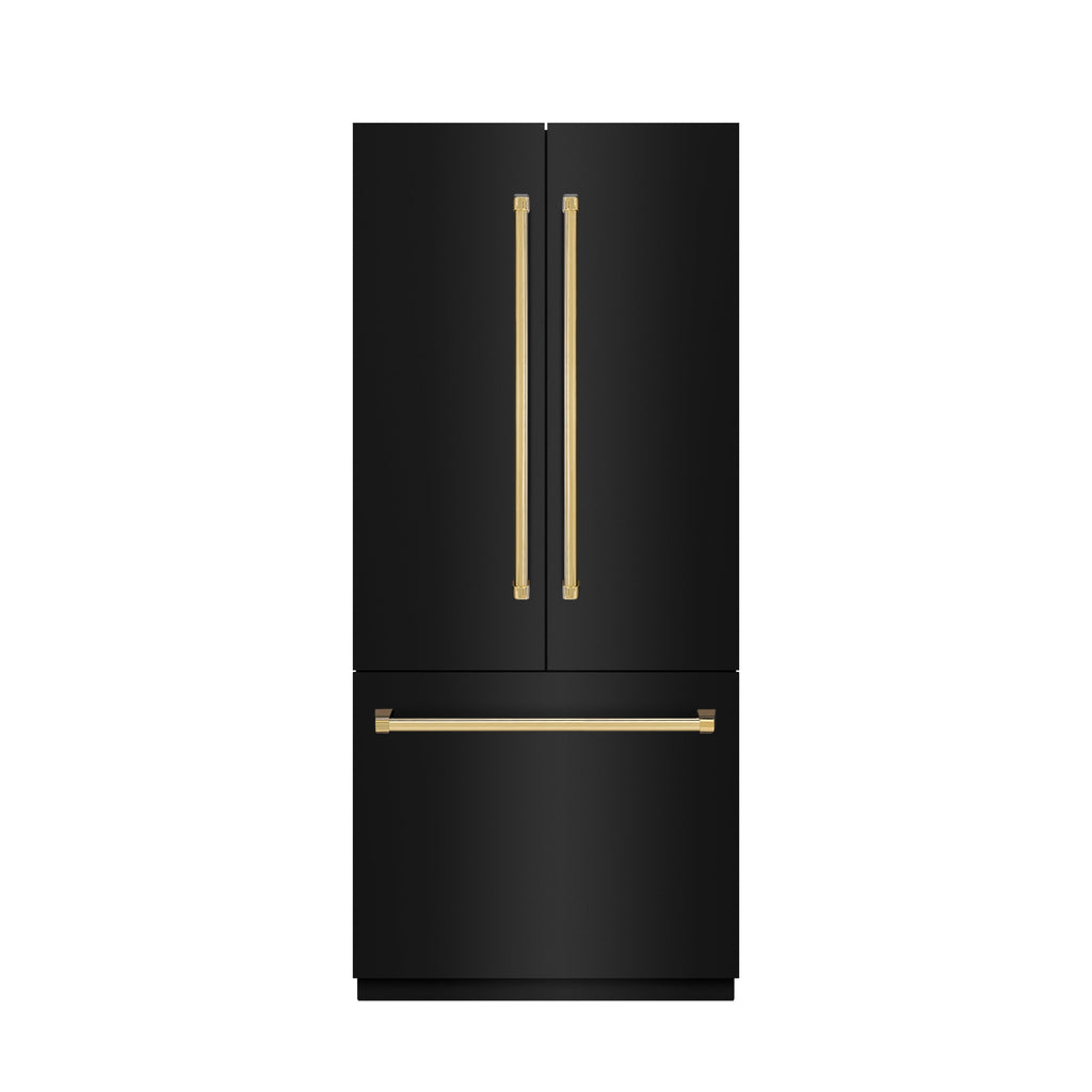 ZLINE Autograph Edition 36 in. 19.6 cu. ft. French Door Built-In Bottom Freezer Refrigerator with Water Dispenser and Ice Maker in Black Stainless Steel with Stainless Steel Interior and Polished Gold Accents (SRBIVZ-BS-36-G)