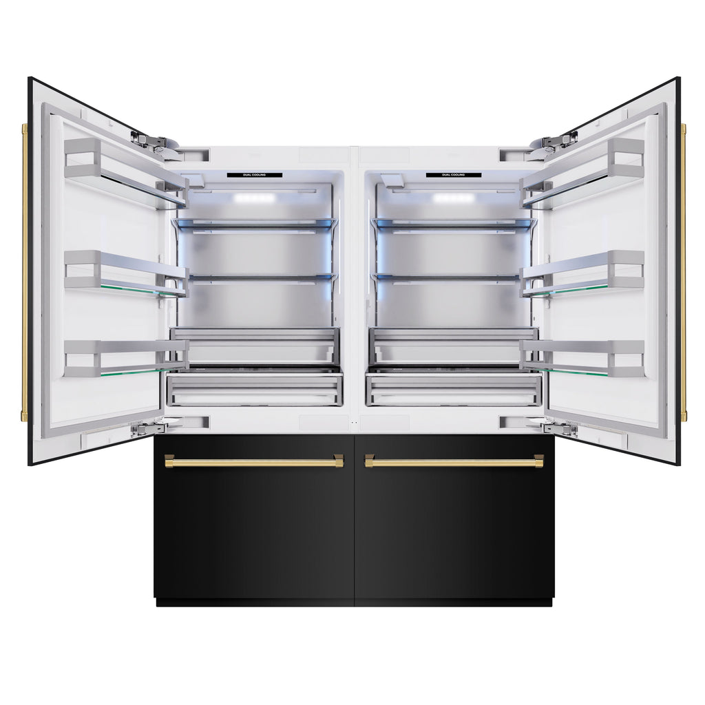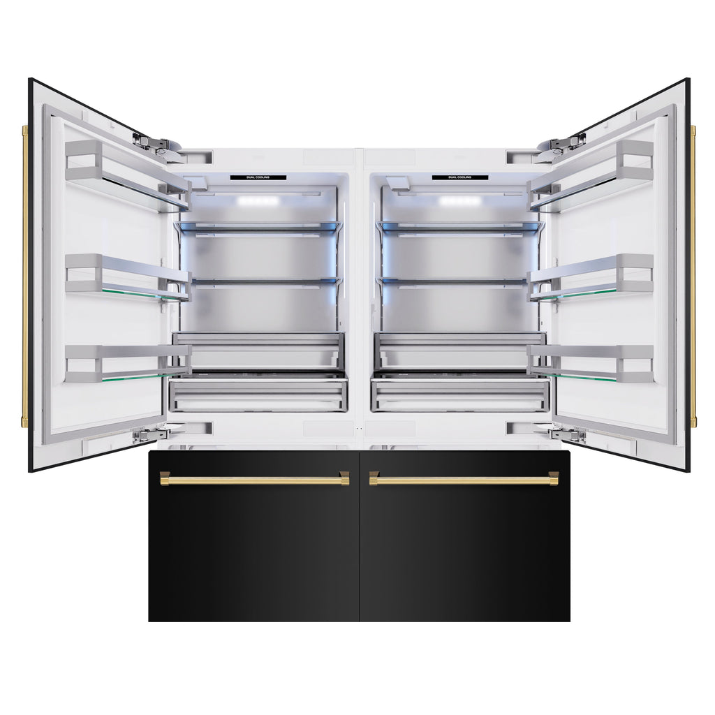 ZLINE Autograph Edition 72 in. 39.6 cu. ft. French Door Built-In Bottom Freezer Refrigerator with Water Dispensers and Ice Makers in Black Stainless Steel and Polished Gold Accents (RBITZ-BS-72-G)