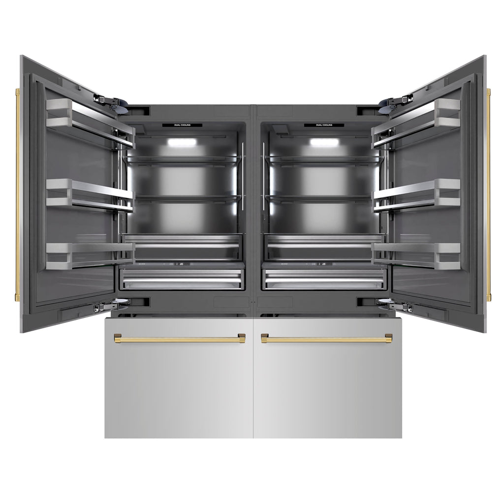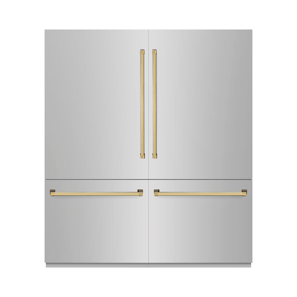 ZLINE Autograph Edition 72 in. 39.6 cu. ft. French Door Built-In Bottom Freezer Refrigerator with Water Dispensers and Ice Makers in Stainless Steel with Graphite Gray Interior and Polished Gold Accents (GRBITZ-304-72G)