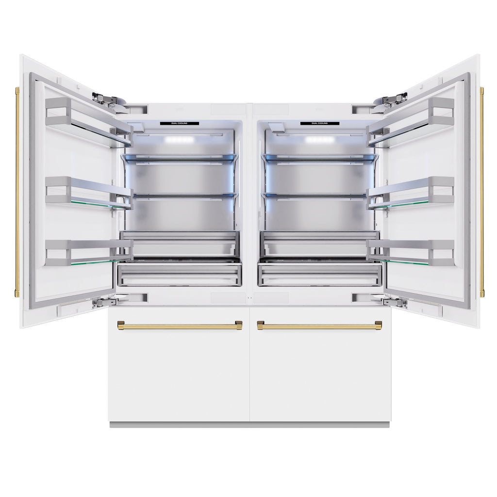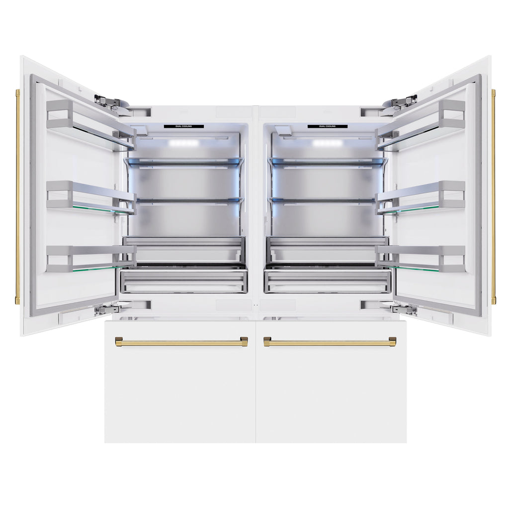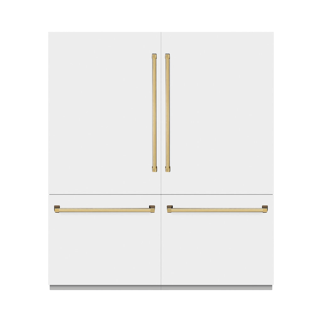 ZLINE Autograph Edition 72 in. 39.6 cu. ft. French Door Built-In Bottom Freezer Refrigerator with Water Dispensers and Ice Makers in White Matte and Polished Gold Accents (RBITZ-WM-72-G)