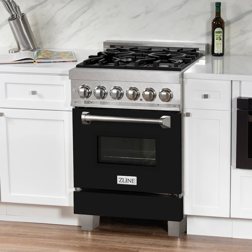 Introducing the ZLINE RAS-BLM-24 Range, exclusively available at your premier kitchen appliance store in Salt Lake City, Utah. As the only authorized ZLINE dealer in Utah, we are dedicated to bringing the finest in kitchen technology to the heart of Salt Lake City. Discover luxury that is not just a desire but a reality with the ZLINE 24-inch Legacy Dual Fuel Range. This exceptional appliance combines a 2.8 cu. ft. electric convection oven with a 4-burner gas cooktop, crafted with precision and elegance in DuraSnow® Stainless Steel and a stunning Black Matte Door featuring a Landscape window design.
